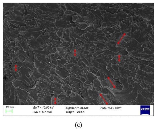 Before conducting the mechanical tests, the morphology of the MWCNT-filled adhesive was investigated using SEM analysis. Figure 5 depicts representative SEM images for the three MWCNT-filled adhesives. The examination of the SEM images has revealed the presence of MWCNT agglomerations despite the special effort spent in the production process to optimize the MWCNTs dispersion. This is mainly due to the high viscosity of the bio-adhesive compared to other polymer matrices. As indicated in Figure 5 by the red the arrows, with increasing the MWCNT content the size and population of the agglomerations increase as well.