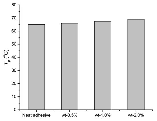 Figure 6 compares the Tg values of the MWCNT-filled adhesives with the value of the neat adhesive. As shown, the addition of MWCNTs leads to a small but considerable increase of the Tg by 1.3%, 3.6% and 5.6% for the reinforcements of 0.5 wt %, 1.0 wt % and 2.0 wt %, respectively. The experimental results are shown in Figure 7. The increase is due to the partial immobilization of the polymeric rings by the MWCNTs and the formation of hydrogen bonds between the adhesive and the MWCNTs [].