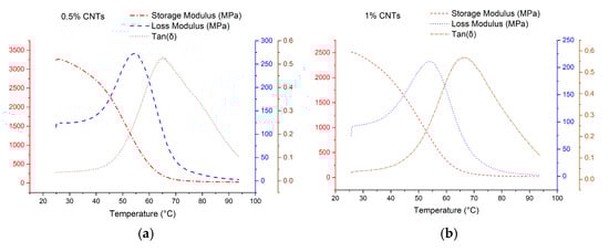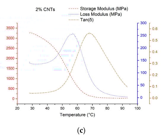 DMA results of the MWCNT-filled adhesive: (a) 0.5 wt %, (b) 1.0 wt % and (c) 2.0 wt %.