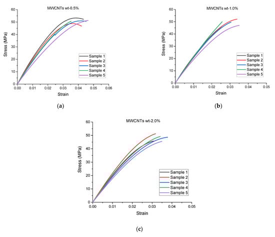Tensile stress–strain curves of the MWCNT-filled adhesive: (a) MWCNTs 0.5 wt %, (b) MWCNTs 1.0 wt %, (c) MWCNTs 2.0 wt %.