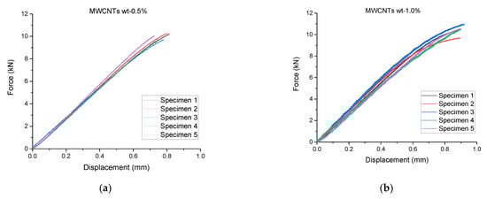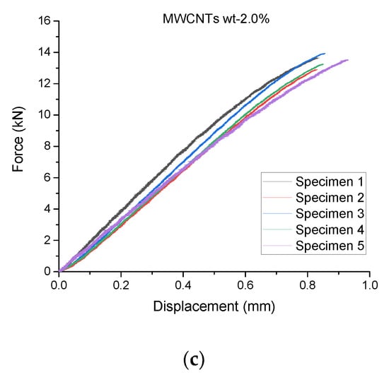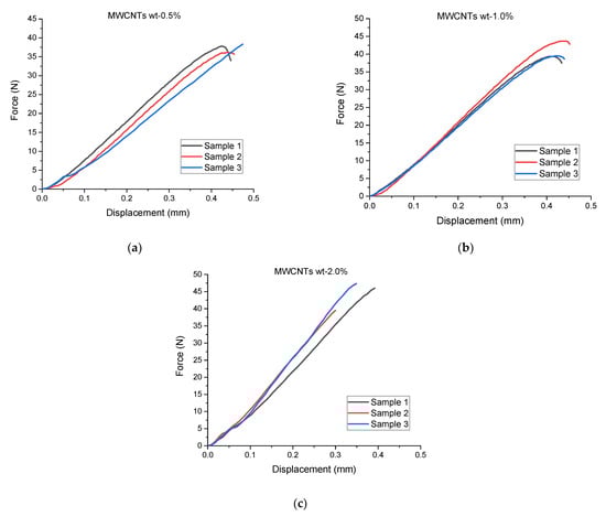 Force-displacement curves of the MWCNT-filled single edged notched bend (SENB) samples: (a) 0.5 wt %, (b) 1.0 wt %, (c) 2.0 wt %.