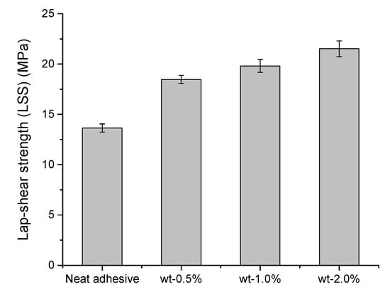 Comparison of the LSS values of the aluminum specimens bonded with the MWCNT-filled adhesive with that of the specimens bonded with the neat adhesive [].
