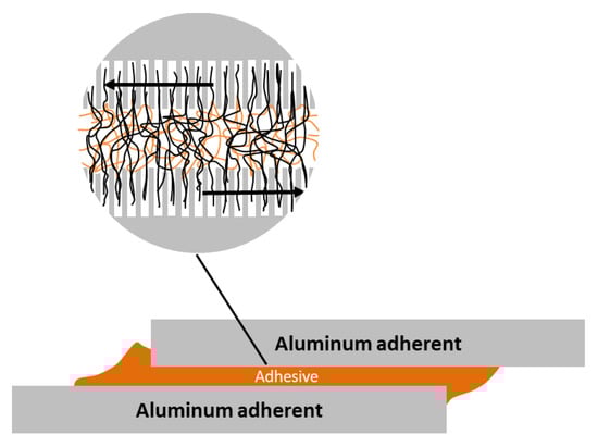 The surface of the aluminum adherents was treated both mechanically using sandpaper and chemically. For the sanding process, a 400-grit sandpaper was used. After the sanding, the adherents were washed-off into a bath of deionized water and brushed with gauze fabric followed by a 10 min ultrasonic cleaning bath at 37 kHz. The chemical treatment was applied according to the ASTM D3933 standard. The adherents were brushed with acetone (solvent clean), and afterwards, immersed into a sodium hydroxide solution (NaOH 5 wt %) for 10 min at 25 °C (alkaline clean). Subsequently, they were immersed into a deionized water bath for 10 min at 60 °C. Nitric acid solution (HNO3 32.5 wt %) was used as a deoxidizer. The adherents were immersed into the nitric acid solution for 8 min at 25 °C. Subsequently, they were immersed into a deionized water bath for 10 min at 25 °C. The anodizing process was carried out into a phosphoric acid solution (H3PO4 12 wt %). For each adherent, one stainless steel rod, which has been thoroughly cleaned by acetone, was immersed inside the phosphoric solution alongside the adherent. Afterwards, the anodizing procedure has taken place for 23 min at room temperature. Finally, the aluminum adherents were immersed into deionized water for 10 min and dried inside a contamination-free oven for 1 h at 40 °C.