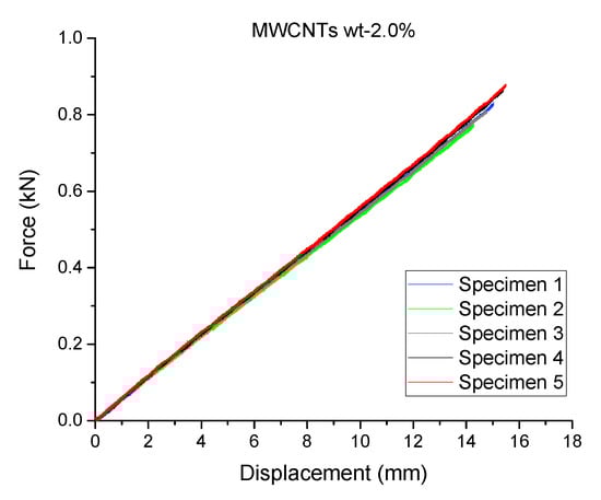 Figure 15 displays the force-displacement curves obtained from the SLS tests conducted on the aluminum bonded specimens. Between the curves, an acceptable deviation is achieved. Figure 16 compares the average values of the LSS of the joints with the MWCNT-filled adhesive with that of joints with the neat adhesive []. The comparison shows that the use of the MWCNT-filled adhesive leads to the impressive increase of the LSS by 35.6%, 45% and 57% for the reinforcements of 0.5, 1.0 and 2.0 wt %, respectively. The increase is mainly due to the mechanical interlocking caused by the nano-stitching of the MWCNTs onto the chemically modified surface of the aluminum adherents [,,] as schematically illustrated in Figure 17.