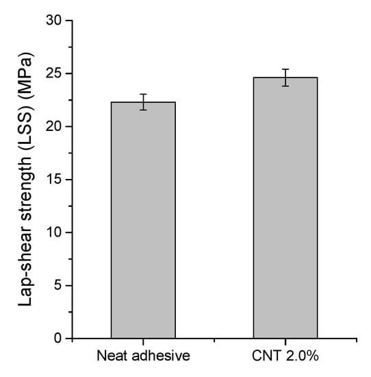Comparison of the average LSS value of the CFRP specimens bonded with the MWCNT-filled adhesive with that of the CFRP specimens bonded with the neat adhesive [].