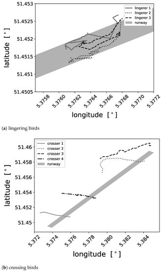Exemplary bird tracks representative for the categories lingering birds (a) and crossing