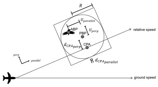 For the probability calculation, the aircraft is set as point mass moving along the runway center line. Both protected volumes are drawn around the bird, resulting in a circle with radius R. The bird is expected at its center, at the Predicted Bird Position (PBP). The actual position of the bird is defined as Actual Bird Position (ABP). The probability calculation is separated into parallel in the direction of the relative speed between bird and aircraft and a perpendicular direction. Hence, the respective distances are divided in the respective components as well. The expected offset between the PBP and the ABP is expressed as uncertainty U. The distance between PBP at the time when the CPA is reached by the aircraft is called .