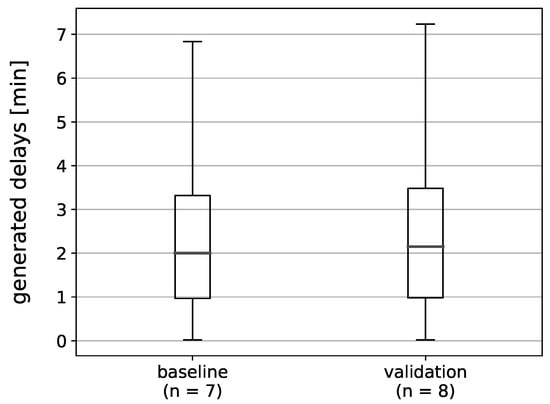 The number of interventions and the resulting delays were considered first. The overview is provided by Figure 5. The average number of delays and the distribution of their duration is comparable between the baseline and the validation. Delays above ten minutes and as such above a tolerable level were outliers. Their share amounted to 0.8% of delays in the baseline and 0.5% in the validation. All aircraft of all scenarios were able to depart within the designated airport opening hours. Hence, the capacity was not impaired.