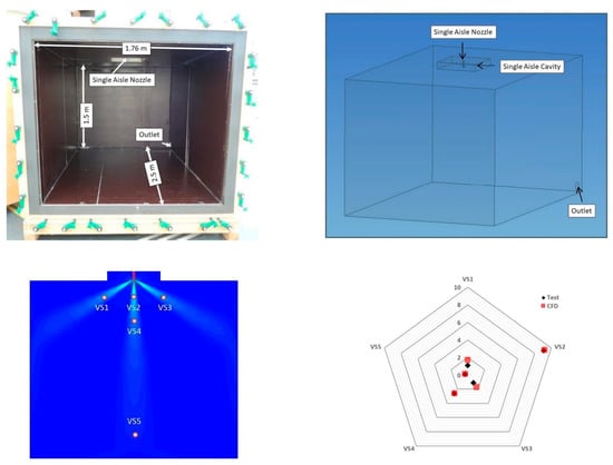 In order to verify the general approach, these CFD simulations were validated by tests on a small prototype single nozzle-cavity demonstrator (Figure 2, top). The nozzle was connected to a nitrogen cylinder, and flow rates and pressure were controlled. Anemometers were placed in the nozzle jet regions, and readings were compared to the CFD calculation (Figure 2, bottom).