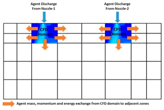 The CFD domain was specifically developed for increasing the accuracy of the zonal modelling approach for the cargo fire suppression application. The inert agent typically is provided from pressurized bottles and is distributed through nozzles in the ceiling of the cargo hold. This results in a local high momentum flow pattern around the inlet nozzle. The scale of this flow is far smaller than the typical size of a zone, but it determines the flow field in the entire compartment. In order to maintain the high simulation speed possible with the zonal modelling approach, the concept of a CFD zone has been selected. In this approach, the nearfield around the injection nozzle is pre-simulated by CFD. Due to the small size of this domain, the CFD computation converges relatively quickly. The simulation result is used as a supply/sink boundary condition in the zonal model in order to transmit the effect of the nozzle to the large space of the cargo hold.