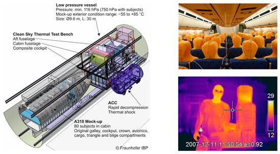 Overview of the Flight Test Facility, cabin equipped with thermal dummies, and IR picture of a human compared to a dummy.