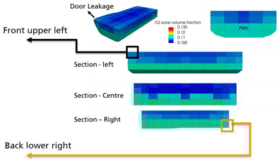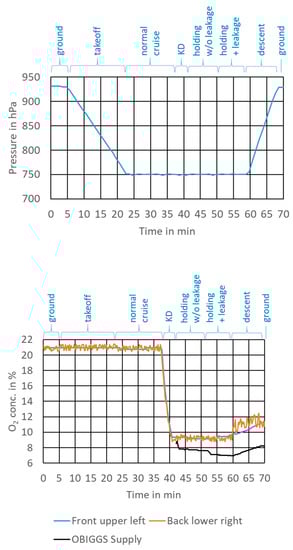 Figure 7, bottom shows the oxygen concentration in the front upper left and back lower right position. It is obvious that the knock-down leads to an instantaneous drop in the oxygen concentration in the cargo hold. During the holding phase, NEA is supplied with a residual oxygen concentration of 7–8%. The measurement indicates that the oxygen concentration is uniform in the cargo bay and no relevant gradient builds up with or without the activated door leakage system. The reason for this is that leakage and the holding supply rate are both balanced at 9 L/s, thus no major ingress of fresh air occurs during this phase. While the door leakage is not activated, the supply of NEA leads to an outflow of air through the PMS. This outflow is redirected to the door leakage when the system is started.