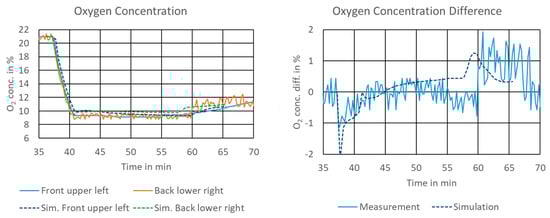 The measured and simulated gradients of the oxygen concentration are shown (Figure 8, right). For this, both sensor readings were subtracted from the concentrations in the zones representative of the sensors. The concentration difference was accurately predicted with a maximum deviation of the simulated and measured difference of less than 1%. The dynamic response of the simulation model was faster than the actual test data. One reason could be the time delay in the sensors to react to such changes or the integration scheme used by the Modelica/Dymola solver.