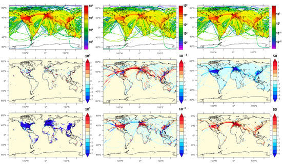 Global distribution of distance flown (left), nitrogen oxides (middle) and soot emission (right): reference case absolute emissions [kg] (upper row), and difference between inventories Flying Higher (middle row) and Flying Lower (lower row) compared to reference case.