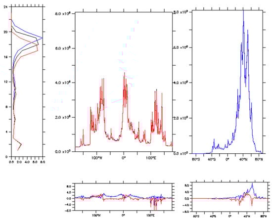 Global distribution of aviation NOx emission mass flux; vertical distribution representing flight levels in 2000 ft steps [108 g] (left), meridional distribution [g] (middle), zonal distribution [g] (right): reference case (REACT4C, black), Flying Higher (blue), Flying Lower (red) and differences [107g] (bottom row): ‘Higher—reference case’ (blue) and ‘Lower—reference case’ (red).