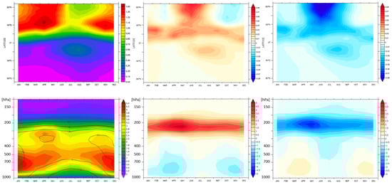 Aviation-induced ozone and changes when aircraft flying at alternative altitudes: Hovmöller diagram (upper row) of aviation-induced ozone (columns in DU), showing seasonal change (Jan-Dec, x-axis) over latitudes (y-axis) and seasonal change of vertical partial columns (lower row) for Jan-Dec (x-axis) of aviation-induced partial ozone columns (in 0.01 DU) over different altitudes (y-axis): aviation signal comparing reference case with no aviation scenario (perturbation, left), and changes in partial columns (in 0.001 DU) for alternative flight altitude inventories with Flying Higher (middle) and Flying Lower (right).