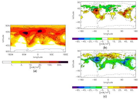 Contrail cirrus radiative forcing for the control inventory (a) and difference between the Flying higher inventory (b) and the Flying lower inventory (c) as simulated by ECHAM4-CCMod [27].