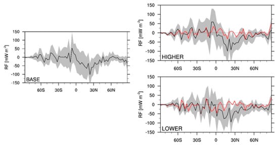Zonal mean radiative forcing (black line) of indirect aerosol (warm) cloud effect from EMAC/MADE for the reference (left) and for inventories ‘Flying higher’ (top right) and ‘Flying lower’ (bottom right). The change between reference and scenarios is highlighted (red line). The shaded regions depict the 95% confidence interval. Radiative forcing is calculated as the difference between two distinct simulations, one with and one without aircraft emissions.