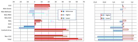 Comparing how the radiative impacts of individual effects change due to the changing flight altitude (Figure 7) reveals that when aircraft fly higher, non-CO2 effects generally increase, while they decrease when aircraft fly lower. For CO2 impacts, we find the opposite sign, because when aircraft are flying higher (lower) CO2 emission, and hence associated climate impact, decreases (increases) slightly. It is important to note that the two largest changes in radiative forcing due to flying lower are connected with contrail cirrus and aerosol-cloud interaction. Both of these radiative forcing components are associated with very large uncertainties and a low level of understanding [18]. While [18] estimated the uncertainty in contrail cirrus radiative forcing to be around 70%, no best estimate for the indirect aerosol effect could be given, indicating that the uncertainties are very large, but are unquantified.