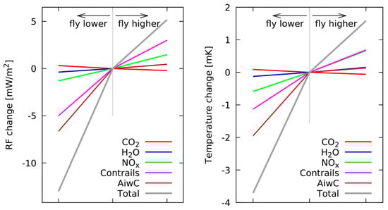 Comparing the climate impact of the Flying Lower scenario given as temperature change with the reference case shows that in our simplified alternative routing study, total impact would be about 4 mK lower, while in the Flying Higher scenario, total climate impact would be about 2 mK higher, noting that large uncertainties remain. In the Flying Lower scenario, we find that for both radiative forcing and temperature change that the CO2 climate impacts slightly increase, while decreasing non-CO2 effects compensate this, resulting in an overall lower climate impact of the Flying Lower scenario. In the Flying Higher scenario, both effects go in opposite directions in a similar way; however, now non-CO2 effects increase, resulting in an overall increase of climate impact. Overall, the aviation-induced temperature change increases by about 10% when aircraft are flying higher, while total temperature change decreases by 20% when aircraft are flying lower. The uncertainty in those changes is very large in particular because they are connected with the cloud related aviation effects that are connected with a very large uncertainty [18].