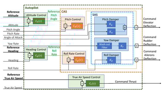 Although this can be easily replaced, the standard flight control law module has a classical structure for fixed wing aircraft, and is based on three nested loops (see Figure 3, namely: a Stability Augmentation System (SAS), a Control Augmentation System (CAS), and an outer Autopilot. These loops can be activated by the User.
