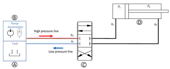 Assuming that ( is the pressure in chamber i with , and are identified on the basis of the servo-valve position. If , chamber is connected to the fluid supply line, then , ; if , chamber is connected with the return line, then , is equal to the pressure of the return line that can be assumed as the pressure in the reservoir. and being the servo-valve densities in the supply and return lines, respectively, the flow rates in the hydraulic actuator chambers are the following: