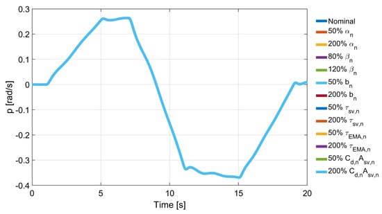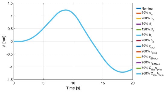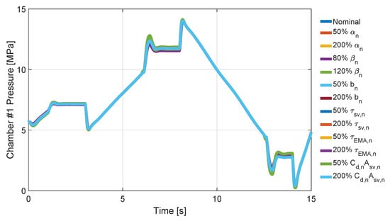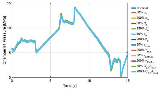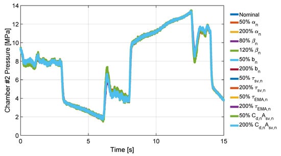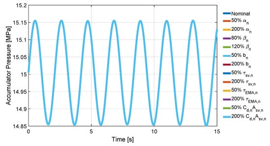 where is the pressure in the accumulator. The maximum pressure delivered by the pump is 200 bar. and are the flow rate provided by the hydraulic pump, and the flow rate across the servo-valve, is a constant obtained from the linearization of the system behavior around its operating conditions and is assumed to be uncertain. is the reference pressure in the accumulator controlled by the HPU local pressure control system.