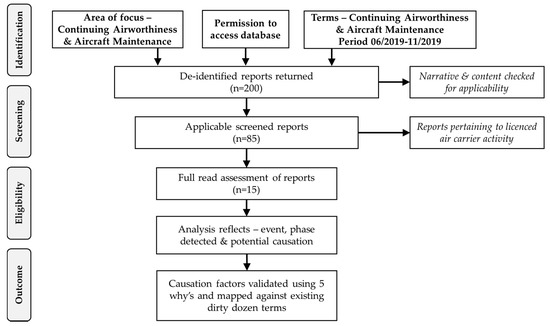 The area of focus for this paper is aircraft maintenance and continuing airworthiness management [4] activities. It was decided to establish contact with an Irish Aviation Authority (IAA) European central repository for aviation accident and incident reports (ECCAIRS) focal point. Following a briefing, a specific permission was granted to review a data set of deidentified mandatory occurrence reports (MOR’s) for the purpose of academic analysis. The operational theatre of activity involved licensed air carriers operating large aircraft on the Irish civil aircraft register. The permission allowed an initial physical database search to be performed from June 2019 to November 2019 using ‘Part 145 (maintenance) and Part M (continuing airworthiness management)’ as the search terms for de-identified report content. Approximately 200 results came back. The narrative and content of each report was reviewed by the researchers for applicability to the analysis. This exercise refined the reports under review to a data set of 85. Figure 2 presents an overview of the analysis framework, described in the sequel.