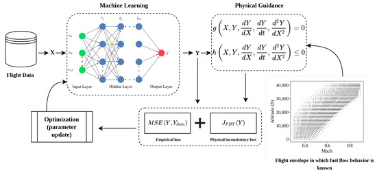 In order to obtain more accurate results and reliable out-of-sample generalization, the vital intention is to merge physics-based models with ML algorithms to leverage their complementary capabilities. Such combined ML-physics models are expected to thoroughly seize the dynamics of scientific systems and improve the knowledge of underlying physical laws [17]. There are several ways to inject physical laws, knowledge, or information into ML models to build physics aware ML models [18]. But physical information often shows a high degree of complexity due to connections among many physical variables diversifying over space and time at various ranges [19]. Conventional ML models can fall short of directly obtaining such relations from data, primarily when given limited measurement data [20]. This scarce data problem is one cause for the failure of the generalization to the circumstances in unseen training data. As a result, several novel research has been used to include physical information into training loss functions to support ML models to seize generalizable patterns consistent with underlying physical laws and governing equations. One of the most common ways to make machine learning models consistent with physical laws is by extending the loss function of the machine learning models to include physical constraints and other physical information [21]. Although the concept of integrating scientific knowledge and machine learning models has only become a popular topic of scientific research in the last few years, there is already extensive literature on this topic [22,23,24]. In the last decade, there has been an increase in utilizing operational flight data, namely Quick Access Recorder (QAR) or Flight Data Recorder (FDR) [25] for many applications such as performance monitoring, anomaly detection, or weather forecasting [26,27,28,29]. These data consist of historical logs of all parameters that can be measured or observed through on-board sensors and systems. Even though they do not have information on the thrust, drag or lift, they record critical performance indicators such as vertical speed, gross weight and fuel flow. This capability makes them highly suitable for the supervised learning of aircraft performance. Chati and Balakrishnan used FDR data in tree-based learning and Gaussian process algorithms to model fuel flow [16,30,31]. Baklacioglu [32] combined genetic algorithms and neural networks for the same purpose. Baumann and Klingauf [10] proposed another scheme for supervised learning of fuel consumption with FDR. The works of Huang et al. [33] and Khadilkar [34] are other examples that have used operational data. These studies proved that aircraft performance can be represented through machine learning techniques. However, they did not investigate model performances in flight regimes that are not covered by the training data. Thus, the applicability of the proposed approaches to the complete flight envelope remains an open issue.
