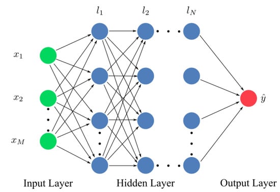 To find the nonlinear mapping for the correction factor , we utilize deep neural networks, which have been proven to capture complex input-output relationships through gradient-based optimization and can be used to model any continuous function [41,42]. A generic structure of a deep neural network consisting of a multilayer perceptron with M input features and N layers is illustrated in Figure 2. It is composed of sequentially connected layers, which comprise sets of neurons that are combinations of mathematical operations followed by nonlinear activation functions. The model parameters are defined as , where , and . The output of the lth layer is: