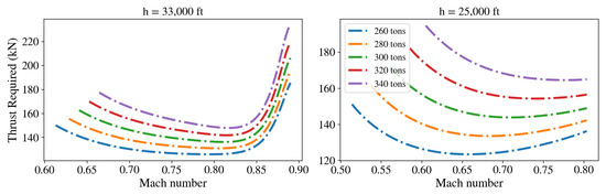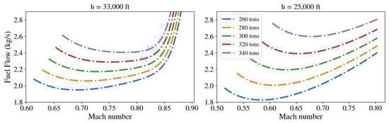 The throttle setting is also referred to RPM or N1. They all determine low-pressure spool speed, which proportionally affects how much fuel is injected into the combustion chamber. In cruise, autopilot systems adjust this parameter to maintain the equilibrium in Equation (13). As seen in Equation (13), pressure ratio dependency is considered to be proportional. Therefore, the nonlinearities are due to Mach number and aircraft mass. Figure 3 illustrates Mach sensitivity of thrust required for selected altitude and mass values. The graphs show higher amounts of thrust required at lower altitudes due to higher density, which results in higher profile drag. Higher air density would also reduce the angle of attack to maintain the same Mach number, hence decreasing the lift coefficient thereby the drag coefficient. However, in this situation, higher density becomes the dominant factor in the thrust required. This can also be directly observed following the parabolic drag polar in which increased density results in the the profile drag dominating the induced drag part. As such, higher aircraft weight results in higher drag due to drag-polar. Transition from thrust to fuel consumption is called thrust specific fuel consumption. Simplified analyses assume it to be constant at each flight level. However, a correction for the Mach number should also be considered because airspeed at the engine inlets affects the engine dynamics, as well. In summary, fuel consumption denoted as F is a function of thrust, Mach number, and altitude. Dependence on altitude is considered to be proportional to the pressure ratio and the square root of temperature ratio. This is shown through dimensional analysis and verified by experimental results [49]. We can formulate fuel consumption F as: