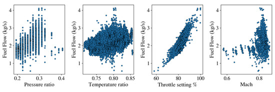 The dynamics described until here were model-based approaches utilized in real-world operations. Figure 5 illustrates how the data present these correlations. They are the results of the combination of all factors. The monotonic relationships with pressure ratio, temperature ratio, and throttle setting are noticeable. However, the Mach number dependency is not clear. Moreover, it is not possible to filter the data for unique aircraft masses and have measurements for every possible Mach number like illustrated in Figure 4. As expected, aircraft operationally had flown only a small subset of the whole flight envelope. The Mach number distribution is skewed, and most of the population is around 0.83, which is usually the nominal cruise speed regime for this aircraft.