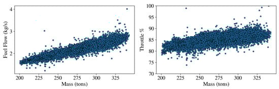 For a greater gross weight, an autopilot system sets throttle to a higher position to maintain Equation (12). Figure 6 depicts gross weight correlation with the throttle , and fuel consumption from data. Higher aircraft masses result in higher throttle settings and higher fuel flows.