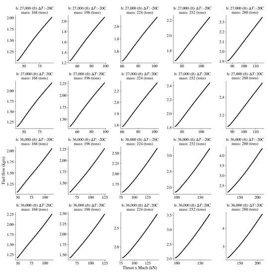 where . Because all regimes show linear tendencies, we can consider fuel consumption as a multiplication of thrust times Mach with a scalar :