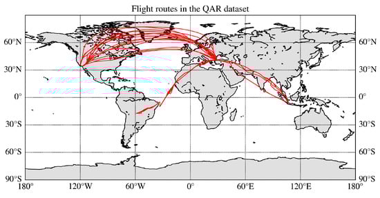 This work utilizes QAR data from a major European flag carrier airline for the design of deep learning neural network architectures. The dataset consists of myriads of features sampled at 1 Hz, which is the maximum recording frequency in flight data recording systems [52]. The dataset of interest for this study includes information about dynamic states of an aircraft (airspeed, altitude, position, vertical speed, and heading), body axis states (angle of attack, and longitudinal and lateral acceleration), performance states (throttle settings, fuel flow from engines, and mass), configuration states (high lift devices, landing gear, and speed brake) and environmental states (wind speed/direction, static and total temperature of air, and air pressure). Even though these states are the most critical variables used in this kind of research, a QAR device usually records more than 1000 features. Table 2 summarizes the variables selected from the QAR dataset used in this work. Because each individual aircraft differs at performance, we have used QAR dataset of a unique tail-number. Figure 8 depicts geospatial distribution of the flight routes in the training data.