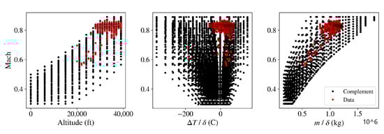 The complementary flight regime set is independent from the data. Its elements are separate from the cruise data . There is no experiment in this paper to find the optimum number of elements of . We selected two hundred distinct flight regimes consisting different values of altitude h, ISA temperature deviation , and aircraft mass . Altitude and ISA deviation are sufficient to calculate pressure and temperature ratio through the following equations: