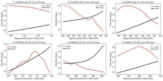 Fuel consumption prediction errors of the generic deep neural network and our physics informed network are shown to be very close on the test set. The main discrepancy between these designs lies in their respective physical consistencies. As illustrated in Figure 7, we expect any physically consistent model to produce an increasing fuel consumption profile with an increasing thrust times Mach input, given an altitude, a ISA deviation, and a reference mass. Figure 10 demonstrates fuel consumption predicted by the generic deep neural network model for six different cases of flight conditions. Even though this model accurately captures the fuel consumption trajectories on the test set, it performs poorly in terms of physical consistency. All fuel consumption profiles in these six regimes have decaying parts, with growing thrust times Mach. Moreover, the behavior is not homogeneous, i.e., the model does not always yield monotonic decreasing curves.