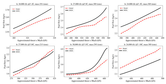 We validate Equation (21) through BADA4. Figure 7 depicts fuel flow with growing term in cruise, given several flight conditions. Note that these are BADA4 model outputs, as well as Boeing’s performance model’s. Each subplot comprises Mach sensitivity similar to thrust and fuel consumption analyses in Section 3. All flight conditions yield increasing fuel flow profiles with increasing . For the rest of the section, we approximate through empirical equations. First, we use the generic drag polar in Equation (14) to approximate the drag coefficient. The thrust required becomes;