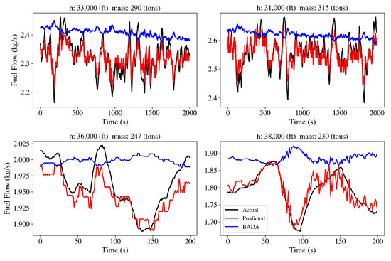 On the other hand, our proposed model, which includes physical loss functions, complies with the physical intuition. Figure 11 reveals that fuel consumption trajectories predicted with the proposed neural network model grow as thrust times Mach values increase. They are not always entirely linear, but do not violate the physics. Additionally, in many cases fuel consumption curves predicted with the trained model is under the ones computed by BADA4. This shows that model-based approaches tend to overestimate fuel consumption for this tail-number aircraft. There are some exceptions, like the example in right-bottom plot in Figure 11. However, we do not have labeled data for this flight regime to justify whether our prediction is very close to the actual. Still, as can be seen in Figure 12, the proposed model adequately predicts the fuel consumption profiles of the test set. Compared to our model, BADA4 overestimates fuel consumption in the test set. Furthermore, our model is able to capture the unknown patterns that BADA4 does not cover. Zoomed regression plots show that the model is able to predict short-period fluctuations. These are due to autopilot modules that control the angle of attack and throttle to maintain level flight. Because NNs are universal function approximators, they can establish such mappings that curve fitting algorithms fail.