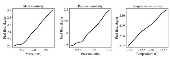Additionally, we show the model’s sensitivity to the other parameters; namely the pressure ratio, temperature ratio, and mass in Figure 13. Because these variables have enough variance in the data, the sensitivity lines are meaningful without including additional loss terms. Among these parameters, temperature is output of a forecast in flight planning. It usually appears at high accuracy, but it is still possible to correct weather uncertainty using data-driven techniques, as well [8]. In conclusion, appending additional loss terms to the empirical error does not diminish the supervised learning performance. Properly selected loss functions even enable the deep neural network to capture further dynamics and flight regimes that data sets do not actually cover.