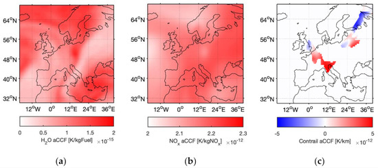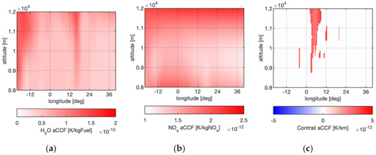 Contrail aCCFs were derived separately for night-time contrails and day-time contrails, since the net contrail climate effect is hugely influenced by the time of the day they occur. It was found that the local temperature (which strongly determines the amount of contrail ice content) in the case of night-time contrails and the outgoing infrared radiation in the case of day-time contrails provide reasonable approximations for the estimation of the climate impact. For both day-time and night-time contrails, the Schmidt–Appleman criterion is applied, which uses temperature and humidity information in order to predict regions where persistent contrails are expected to form [18]. According to Figure 1c, the resulting contrail aCCF on 18 December 2015, 6.00 p.m. UTC on flightlevel 390 shows a strong warming area from the East of France over Switzerland to the North of Italy and a second warming area over Latvia, Lithuania, and Belarus. According to Figure 2c, the warming area over France has a large vertical dimension between 9000 m and 12,000 m. Additionally, cooling areas are observed in the South of Great Britain, Poland, and Finland.