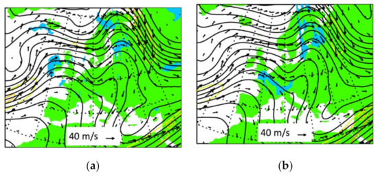 Geopotential height (black contours), wind situation (arrows), and regions of potential contrail formation (blue) over Europe on 18 December 2015, 12.00 pm UTC based on European Centre for Medium-Range Weather Forecasts (ECMWF) ERA-Interim re-analysis data on pressure levels 250 hPa (a) and 200 hPa (b).