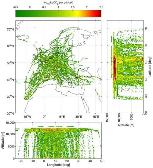 Figure 4 shows the cumulative CO2 emissions of the reference air traffic on 18 December 2015 between 11.30 a.m. and 12.00 p.m. UTC (colors) and the location of 1210 aircraft that have been flying at 12.00 pm UTC (black dots). In the reference case, the majority of emissions is released at altitudes between 11,000 m and 12,000 m, latitudes between 40° and 52° N, and longitudes between 15° W and 25° E.