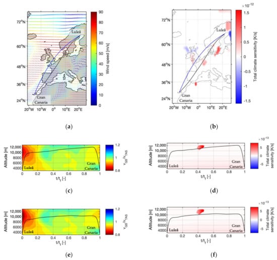 Optimized trajectories for the route Luleå-Gran Canaria. The lateral path of the minimum fuel trajectory (black) is illustrated including the wind situation (a) and the total climate sensitivity (b) at an average altitude of 10,686 m. The orthodrome is depicted in blue. The lateral path of the minimum climate impact trajectory is not shown separately, since only minor deviations from the minimum fuel trajectory occur. Altitude profiles along the cross section of the lateral path are shown for the minimum fuel case (c), (d) and the minimum climate impact case (e), (f) as a function of the relative flight time t/tf. The wind situation for the vertical trajectories is indicated as ratio between ground speed and true airspeed . Values greater than one indicate tailwind areas, values smaller than one indicate headwind areas.