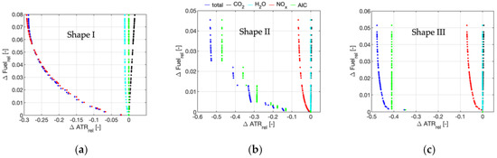 During the analysis of the results of the top 2000 routes, which together represent 36.9% of the total available seat kilometers of the investigated reference scenario, three characteristic shapes (shape I, shape II, shape III) have been identified, which include smooth curves as well as discontinuous Pareto fronts (see Figure 6). Shape I occurred in 892 cases (41.6%) and is characterized by a smooth overall Pareto front (see Figure 6a), which has no contrail impact (green curve) and is dominated by the climate impact reduction of NOx (red curve). Caused by detours compared to the minimum fuel solution, the fuel burn and hence the climate impact of CO2 is increasing (black curve). In the second case (shape II) which was identified in 1009 cases (50.45%), contrail areas along the route are involved (see Figure 6b). Only minor trajectory changes lead to a large partial or even full avoidance of contrail-sensitive areas and hence cause large climate impact reductions. Therefore, a discontinuous behavior of the climate impact of contrails (green curve) and the overall Pareto front (blue curve) can be observed. Additional climate impact reductions may occur due to the reduction of the climate impact of NOx (red curve). Shape III was observed in 159 cases (7.95%) and is characterized by a minimum fuel trajectory, which passes a contrail-sensitive region at its edge (see Figure 6c). Consequently, small trajectory changes that cause only low amounts of additional fuel burn lead to a full avoidance of contrails and hence the related climate impact (green curve). Further climate impact reductions are possible by deviating to regions with lower climate sensitivities with respect to NOx emissions (red curve).