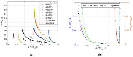 Moreover, Figure 7b shows the average Pareto front for the top 2000 routes. A maximum climate impact reduction of about 76% can be achieved if a fuel penalty of 12.8% was accepted. Higher climate impact mitigation efficiencies (climate impact reduction per fuel increase) are obtained at low fuel penalties; e.g., a fuel penalty of 0.75% may already lead to a climate impact reduction of about 50%. The individual contribution of the species indicates that the climate impact reduction for the investigated weather pattern is dominated by the reduction of the contrail climate impact (green dots) followed by the reduction of the climate impact of NOx (red dots). Changes of the climate impact contributions of CO2 (black dots) and H2O (cyan dots) only have minor impacts on the overall Pareto front (blue dots). However, for this study, a weather situation with high contrail formation probabilities over Central Europe has been chosen (see Figure 1c and Figure 3b). Consequently, mitigation potentials and efficiencies may look very different for other weather situations and regions of the world. Figure 7b also shows that a reduction of the climate impact not only leads to higher fuel consumption but also to increased flight times (orange crosses). Additional fuel burn and flight time are correlated almost linearly. However, the flight time increase tends to be always 1–2% higher than the fuel burn increase; e.g., a fuel increase of 5% is related with a flight time increase of 6.4% (see black arrows).