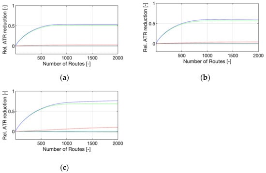 Figure 8 shows the cumulative climate impact reduction as a function of the number of changed routes for a fuel penalty of 1% (a), 2% (b), and 12.8% (c). The routes have been sorted according to their absolute climate impact reduction. At a fuel penalty of 1%, which is related to a climate impact reduction of approximately 53% (see Figure 7b and Figure 8a), the adaption of only 500 of the total 2000 routes would already yield about 85% of the full potential, resulting in a total climate impact reduction of 45%. This effect slightly decreases for increasing fuel penalties: at 12.8% fuel penalty, 500 routes are related with about 75% of the overall potential and hence a climate impact reduction in the order of 55% (see Figure 8c). Since the slope of the individual contribution of the climate impact of contrails tends toward zero after about 1000 changed routes in all three cases (green curve), for this particular weather situation, it can be concluded that routes, which allow for the avoidance of areas where persistent contrails may form, are often characterized by high climate impact mitigation potentials and hence should be changed first.