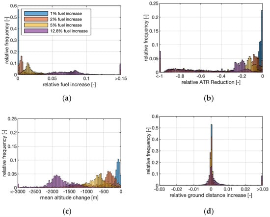 Frequency distributions of the relative fuel increase (a), the relative ATR reduction (b), the mean altitude change (c), and the relative ground distance increase (d) compared to the minimum fuel trajectory based on the top 2000 routes for 1% (blue), 2% (orange), 5% (yellow), and 12.8% (purple) overall fuel penalty.