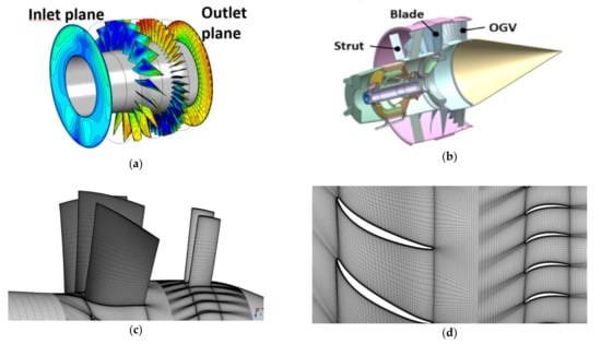 Computational domains. (a) Inflow plane to outlet at nozzle; (b) overview of fan module; (c) meshes over blade surfaces; (d)mesh showing resolution in the blade-to-blade plane.