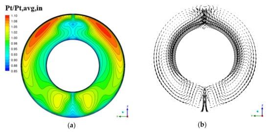 Inlet boundary plane. (a) Total pressure coefficient; (b) in-plane swirl direction vectors.